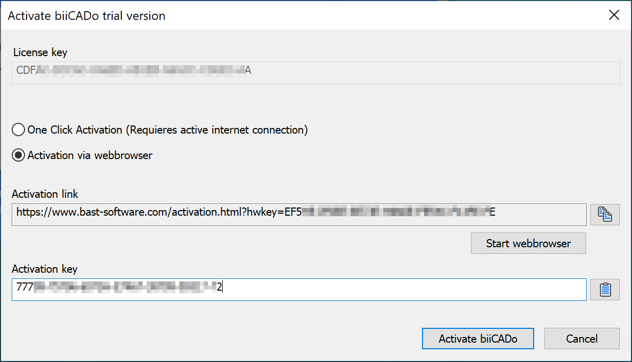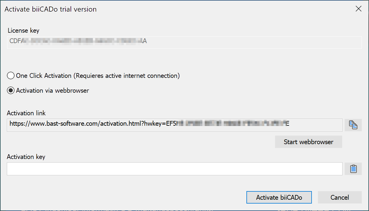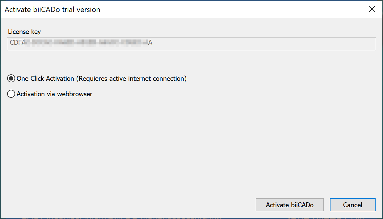 If you do not have a license key yet, you can activate biiCADo once for 30 days for test purposes.