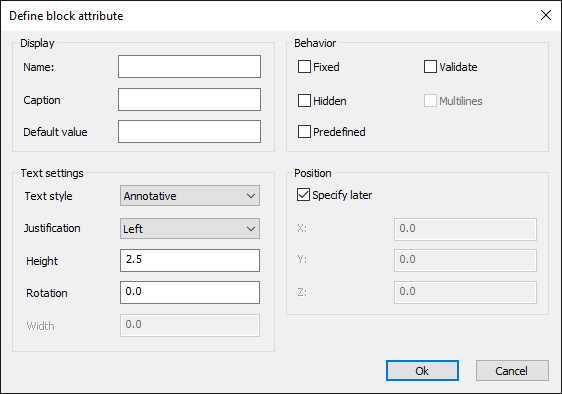 Coordinates X,Y,Z: Define the coordinates of the insertion point if the Specify later option is not set. - Click OK to insert the Attribute into the drawing.