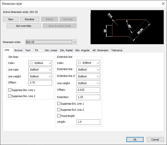 With the DimStyle command you can define new dimension styles and activate, change or delete existing dimension styles.
