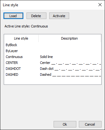 With the command Linetype you can load new line types, activate and delete existing text types.