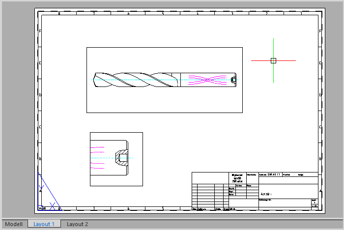 To print the drawing, switch to paper space. You can create one or more layouts (print pages) here. In a layout, you create various layout viewports and other elements such as a title block or parts list. A layout viewport shows a portion of model space. The model space views are scaled relative to paper space. A drawing unit in the paper area is the same as the unit on the paper side (millimeters or inches, depending on the setting).