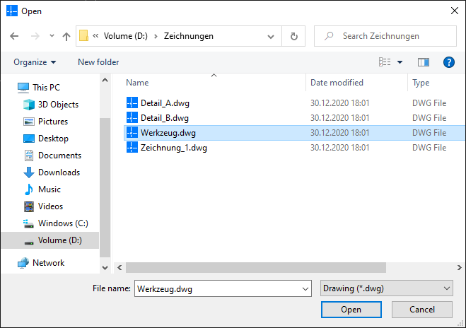 Managing drawings Opening a drawing How to open a drawing: Click on File > Open on the Ribbon. or Enter OPEN in the command window. Select the drawing in File Explorer that you want to open. Click the Open button.