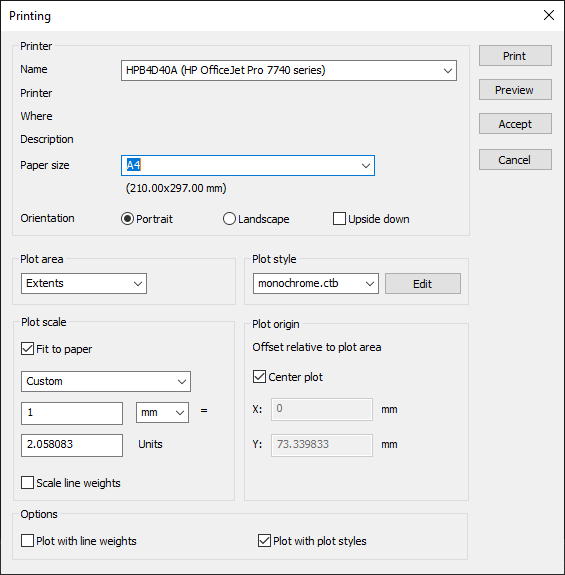 Either select the option "Plot centered" or specify the X and Y coordinates of the plot origin relative to the lower left corner of the paper. - Set further plot options.