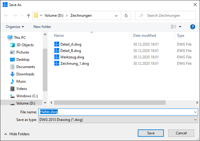 Managing drawings Renaming a drawing How to save the current drawing under a name: Click on File > Save as on the Ribbon. or Enter SAVEAS in the command window. Specify a storage location, a file name and the file type. Click the Save button.